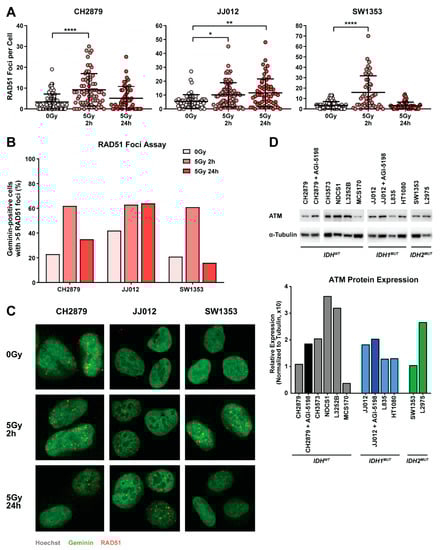 - Inoue, S.; Li, W.Y.; Tseng, A.; Beerman, I.; Elia, A.J.; Bendall, S.C.; Lemonnier, F.; Kron, K.J.; Cescon, D.W.; Hao, Z.; et al. Mutant IDH1 Downregulates ATM and Alters DNA Repair and Sensitivity to DNA Damage Independent of TET2. Cancer Cell 2016, 30, 337–348. [Google Scholar] [CrossRef] [PubMed]