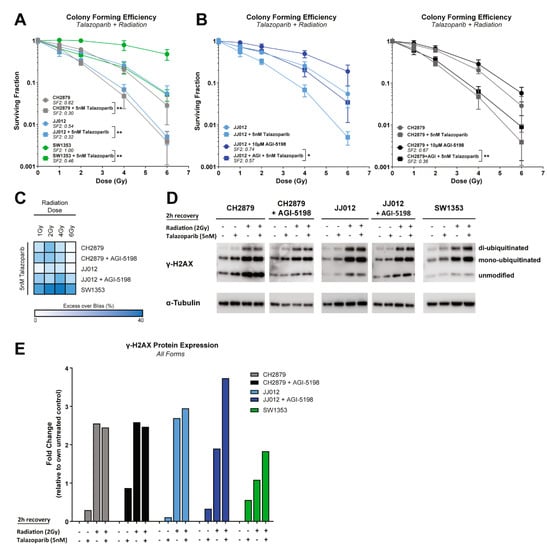 - Césaire, M.; Ghosh, U.; Austry, J.-B.; Muller, E.; Cammarata, F.P.; Guillamin, M.; Caruso, M.; Castéra, L.; Petringa, G.; Cirrone, G.A.P.; et al. Sensitization of chondrosarcoma cells with PARP inhibitor and high-LET radiation. J. Bone Oncol. 2019, 17, 100246. [Google Scholar] [CrossRef]