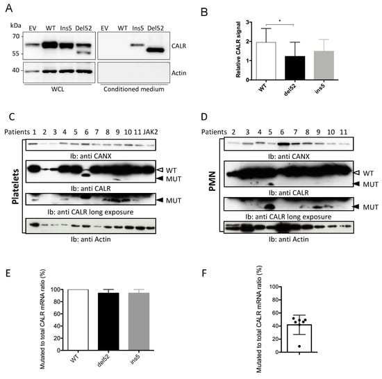 Calreticulin (CALR) mutant proteins are faintly expressed in the transfected and primary cells. (A) HEK293T cells were transfected with plasmids to express wild type (WT) or mutant CALR proteins. Forty-eight hours later, total cell lysates (TCL) and supernatant precipitates were subjected to western-blot analysis using anti-total CALR antibody. Actin serves as a loading control for cell lysates. (B) Quantification of signals measured on western-blot analysis of total cell lysates of transfected HEK293T cells performed in (A). Results are expressed as the ratio of CALR to actin signal normalized on the “Empty Vector” condition. The histogram represents the mean ± standard error of the mean (SEM) of six independent experiments. * p < 0.05 Platelets (C) and polymorphonuclear cells (PMN, (D) were purified from peripheral blood of 11 CALR mutated (patient numbers 1 to 11) and one JAK2V617F mutated MPN patients. CALR protein expression was assessed by western blotting using antitotal CALR antibody. Actin was used as loading control. The white arrowhead indicates WT CALR, the black one the position of the type-1 (del52) mutant CALR. All patients present a type 1 mutation (del52), except patient 6, who exhibits a homozygous type 2 (ins5) mutation. (E) Quantification of CALR mutant ratio on RNA of HEK293T 48 h after transfection. Results are expressed as the ratio of the copy numbers of mutant to total CALR. The histograms represent the mean +/− SEM of three independent experiments. (F) Quantification of CALR mutant ratio on RNA purified from peripheral PMN. Results are expressed as the ratio of the copy numbers of mutant to total CALR.