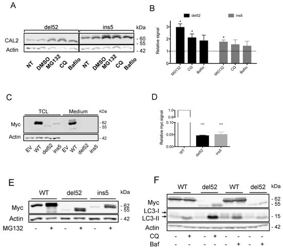 These results indicate that both leakage to the extracellular medium and increased proteasome degradation participate in the reduction of mutant protein levels. The secretion mechanisms are relatively straight-forward, given the loss of the KDEL motif; however, the precise pathway leading to excess mutant CALR degradation has never been investigated. To study the processes controlling expression of CALR variants more precisely, we generated plasmids allowing the expression of Myc-6His-tagged CALR proteins, which could be readily revealed by Western blotting of their Myc epitope. The CALR proteins produced from these vectors are depicted in Figure S1A. After HEK293T cell transfection, WT CALR was expressed at high levels, whereas the expression of both mutants was very low (with an about 20-fold lower expression for del52 and ins5 mutants compared to the WT protein), as seen in Figure 2C,D. In contrast to “untagged” proteins, Myc-6-His-tagged CALR mutant proteins were not detected in the cell supernatant, as seen in Figure 2C, probably because the C-terminal part of the protein and thus the Myc-6His tag had been cleaved as previously suggested []. In these cells, the proteasome inhibitor MG-132 increased mutant CALR expression by a mean factor of five, as seen in Figure 2E.