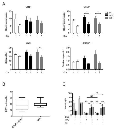 Impact of Calreticulin (CALR) mutant expression on endoplasmic reticulum (ER) homeostasis. Hematopoietic cell lines were transduced with pCW57.1 vector enabling tetracyclin-inducible expression of Myc-6His tagged wild type (WT) or mutant CALR. (A) The expression of Unfolded Protein Response (UPR) target genes was assessed in DAMI cells by RT-qPCR before and 48 h after treatment by doxycyclin (+Dox). GAPDH was used as control gene. The histograms represent the mean ± standard error of the mean (SEM) of three independent experiments. ** p < 0.01. (B) Leucocytes were obtained from peripheral blood samples of CALR mutated or patients presenting with reactive hyperleucocytosis and/or thrombocytosis (RHL). After extraction of RNA, XBP1 splicing was assessed by RT-PCR and densitometry analysis. The boxes represent the dispersion from minimum to maximum values. Ten patients were tested in each group. (C) Cell mortality induced by Tunicamycin (Tc, 10 μg/mL) was assessed by Annexin V- 4’,6-diamidino-2-phénylindole (DAPI) labeling in UT-7-MPL cells 24 h after CALR transgene expression induction by Doxycyclin (Dox). These experiments were performed in the presence or in the absence of thrombopoietin (TPO). Dimethyl Sulfoxide (DMSO) was used as a vehicle control. Results are expressed as the mean proportion of cells positive for Annexin V in four independent experiments.