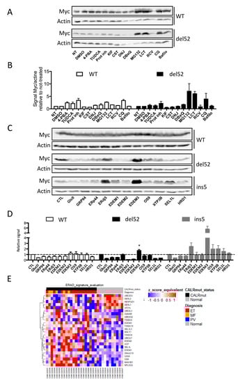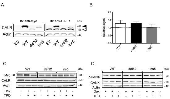 Expression of Calreticulin (CALR) mutants does not alter the expression of endogenous CALR protein. (A) HEK293T were transfected with pcDNA6 plasmids to express Myc-6His tagged wild type (WT) or mutant CALR proteins. Forty-eight hours later, endogenous WT CALR expression was assessed by western blotting using the antitotal CALR antibody. Actin was used as a loading control. Note that because of the presence of the tag, the CALR proteins present with an increased apparent molecular weight (MW) compared to the nontagged forms. Hence, WT and ins5 proteins (black arrowhead) present a MW superior to the endogenous nontagged WT CALR protein (white arrowhead), while the tagged form of del52 protein (the Molecular Weight of which is lower than that of WT and ins5) present the same MW as the WT endogenous protein. (B) The expression of endogenous CALR was quantified and expressed as the ratio of CALR to actin signal and normalized against the “empty vector” (EV) condition. For Myc-6His tagged del52 mutant CALR (which presents the same MW as the endogenous CALR) a correction was applied by subtracting the signal generated by the transgene estimated from the comparison of the signal measured for WT and ins5 CALR with anti-Myc and anti-CALR antibodies. Results are presented as mean ± standard error of the mean (SEM) of three independent experiments. (C) UT-7 cells were transduced with pCW57.1 vector enabling tetracyclin-inducible expression of Myc-6His tagged WT or mutant CALR. Expression of WT, type 1 (del52), and type 2 (ins5) CALR mutants was induced by Doxycyclin treatment. Forty-eight hours later, endogenous WT CALR expression was assessed by western blotting using the antitotal CALR antibody. Actin was used as a loading control. For Myc labeling, * denotes the specific signal, as determined by the molecular weight. (D) Expression of WT, type 1 (del52), and type 2 (ins5) CALR mutants was induced in UT-7 cells using a tetracyclin-inducible vector. Forty-eight hours later, Calnexin (CANX) expression and phosphorylation were assessed by western blotting. Actin was used as a loading control.