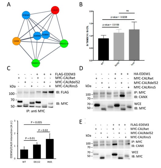 We then collated all the information gathered in our siRNA screen, the available databases, and the literature. This identified a CALR closed network containing the EDEM proteins, as seen in Figure 6A, blue nodes, the CALR homolog CANX, as seen in Figure 6A, orange node, and the thioredoxin domain containing proteins DNAJC10 and TXNDC11 [], as seen in Figure 6A, green nodes. Based on this, we first tested whether siRNA-mediated silencing of TXNDC11 impacted on the expression of CALR mutants. This showed that TXNDC11 expression attenuation led to a stabilization of both del52 and ins5 variants, as seen in Figure 6B. As such, together with the results obtained in Figure 5, this shows that specific thioredoxin domain containing proteins might be involved in the degradation of CALR variants, with a preferential impact on the ins5 mutant. Since EDEM3 silencing was found to stabilize both del52 and ins5 variants, we then tested whether these proteins could be found in a complex. Coimmunoprecipitations studies showed that the del52 and ins5 variants were more prone to be found in EDEM3-containing complexes than the WT CALR, as seen in Figure 6C. To follow up on the CALR network identified in Figure 6A, we monitored the presence of complexes comprising both CANX and CALR, and evaluated whether the expression of EDEM1 or EDEM3 might impact on those complexes. This showed that overexpression of EDEM1 selectively stabilized a del52 CALR/CANX complex, as seen in Figure 6D, whereas the overexpression of EDEM3 did not significantly impact on the formation of mutant CALR/CANX complexes, but increased the WT CALR/CANX complex, as seen in Figure 6E. These results show that the expression of CALR variants is dependent on a proximal ER quality control system, most likely including EDEM3, TXNDC11, and DNAJC10, which, when deregulated in MPN, might lead to sufficient stabilization of the proteins to yield constitutive MPL activation.