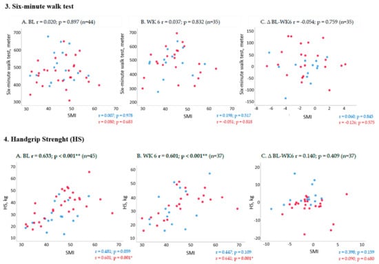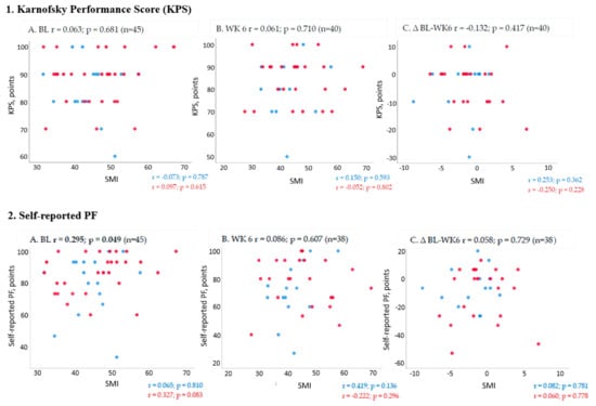 Scatterplots and Spearman’s Rho correlation coefficients (r) and p-values for skeletal muscle index (SMI) on the X- axis and the following physical function (PF) outcomes on the Y- axis 1. Karnofsky performance scale, 2. Self-reported PF, 3. Six-minute walk test, 4. Handgrip strenght and 5. PA, steps. Correlations are shown for all patients at (A) baseline (BL), (B) 6 weeks (WK 6) and (C) change from baseline to end of trial (∆ BL-WK 6). Statistically significant correlations are highlighted by bold types and the pre-fix * = correlation is significant at the 0.05 level, ** = correlation is significant at the 0.01 level. Sub-group analysis based on cachexia status at baseline are marked by blue dots=no/pre cachexia and red dots=cachexia in the scatter plots and correlation coefficients (r) and p-values are inserted below the plots for each sub-group.