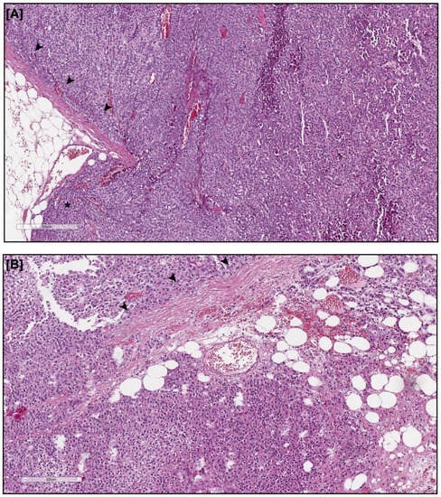 Capsular invasion in advanced ACC. (A) Representative Hematoxylin/Eosin staining of an advanced stage 3-ACC showing disruption of the capsule with pushing a well-circumscribed tumor border (*) into the surrounding adipose tissue. (B) Representative Hematoxylin/Eosin staining of an advanced stage 4-ACC displaying cancer extension beyond the capsule with irregular clusters and cords of tumor cells infiltrating the fat. Arrowheads indicate the remaining adrenal capsule. Scale bars = 300 μm (A) and 400 μm (B).