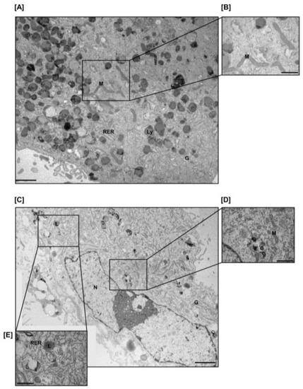 ASC ultrastructure shows radical changes after co-culture. ASCs cultured alone (A, zoom in B) or in the presence of H295R (C, zoom in: D,E) for 7 days, n = 3 independent experiment. Representative different fields with the same original magnification were digitally merged to reconstruct a wider cell portion. N = nucleus; M = mitochondria; RER = rough endoplasmic reticulum; Ly = lysosome; G = Golgi cisternae; L = lipid droplet. Scale bars = 2 μm (A,C) and 1 μm (B,D,E).