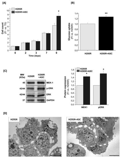 H295R cell proliferation rate increases in the presence of ASCs. (A) H295R cells alone (H295R) or co-cultured with ASCs (H295R+ASC) were assessed for cell proliferation at the indicated time points (2, 3, 7 and 9 days) by direct cell count. The proliferative rate was indicated as fold increase (FI) versus the co-culture starting time (T0: Time = 0). Glucose uptake measurement (B) and western blot analysis of MEK1, ERK and phospho-ERK expression (C) were compared in H295R cells after mono- or co-culture. For western blot analysis, GAPDH was used as internal loading control. Both glucose up-take and protein expression were calculated as fold increase (FI) versus H295R cells alone. (D) Electron microscopy of H295R cells cultured alone or together with ASCs for 7 days. The black arrow indicates the structures corresponding to lipid droplets. N = nucleus. Scale bars = 5 μm. Data are expressed as the mean ± SE vs. H295R cell alone, n = 3 independent experiments; * p < 0.05; ** p < 0.001. Details of western blot can be viewed at the Supplementary Materials.