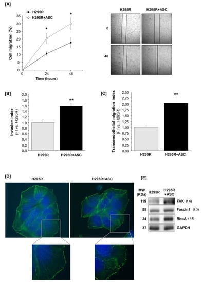 H295R cell migration and invasion ability is increased by ASC co-culture. (A) Scratch assay: cell migration at 0, 24 and 48 h post-scratch in H295R cells previously cultured alone (H295R) or co-cultured with ASCs (H295R + ASC) for 7 days, and related representative images of n = 3 independent experiments. Original magnification: 5×. (B) Cell invasion assay: the invasion index was calculated as fold increase (FI) versus H295R cells alone. (C) Trans-endothelial migration assay: the invasion index was calculated as fold increase (FI) versus H295R cells alone. (D) Fluorescence staining of F-actin cytoskeleton (in green) in H295R after 7-day mono- or co-culture. DAPI staining (in blue) was used to visualize cell nuclei. Original magnification: 100×; zoom in: 2×. (E) Western blot analysis of FAK, RhoA and Fascin-1 performed on H295R cells cultured alone or together with ASCs for 7 days. GAPDH was used as internal loading control (fold increase intensity vs. H295R cells after normalization on GAPDH band is indicated to the right of the bands). Quantitative data are expressed as the mean ± SE vs. H295R alone in at least three independent experiments; * p < 0.05; ** p < 0.001. Details of western blot can be viewed at the Supplementary Materials.