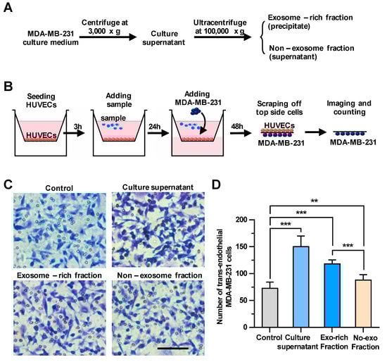 The cancer cell-derived culture supernatant and the exosome-enriched fraction significantly enhance the transendothelial migration of breast cancer cells. (A) A scheme for the preparation of the cell culture supernatant, the exosome-enriched fraction and non-exosome fraction. (B) A schematic diagram of the transendothelial migration assay. (C) The transendothelial migration of breast cancer cell MDA-MB-231 after treating human umbilical vein endothelial cells (HUVECs) with the culture supernatant, exosome-enriched precipitate or non-exosome supernatant fractions. Scale bar, 100 μm. (D) Quantitative analyses of the migrated MDA-MB-231. Three independent experiments were performed, in which cell numbers in eight photo images were counted. ** p < 0.01, *** p < 0.001 by unpaired Student’s t-test.