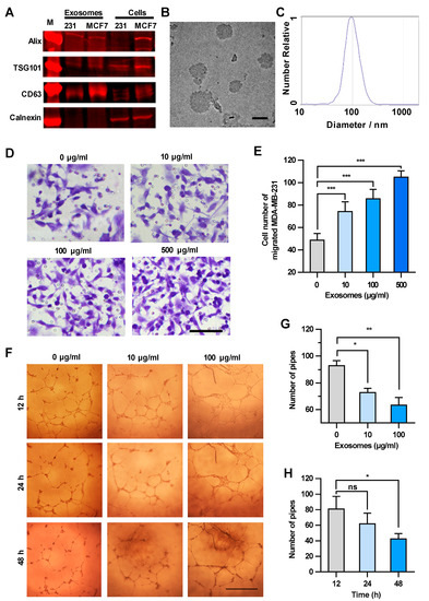 Exosomes enhance the transendothelial migration of breast cancer cells and inhibit the HUVEC tube formation. (A) Expression of exosome markers in MDA-MB-231 exosomes revealed by Western blot analysis. (B) An electron microscopic image of exosomes (red arrows) derived from MDA-MB-231. Scale bar, 100 nm. (C) Granularity and uniformity of exosomes determined by nanoparticle tracking analysis. (D) Images of transendothelial MDA-MB-231 cells after treating HUVECs with different concentrations of exosomes. Scale bar, 100 μm. (E) Migration of MDA-MB-231 through HUVECs layers after treatment with MDA-MB-231-derived exosomes. (F) Image of tube formation in exosome-treated HUVECs. Scale bar, 1 mm. (G) The tube formation in HUVECs treated with different concentrations of exosomes. (H) Time course of the tube formation in HUVECs treated with 100 μg/mL exosomes. Data are shown as means ± standard deviation (SD) and results were from three independent experiments. * p < 0.05, ** p < 0.01, *** p < 0.001; ns, no significance by unpaired Student’s t-test.
