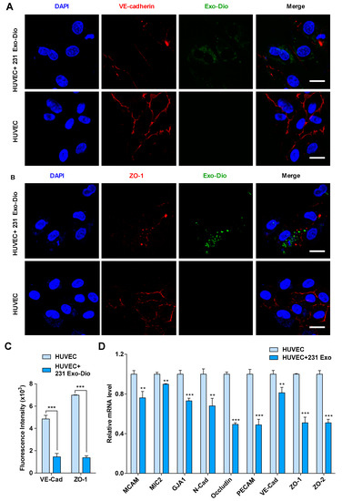 It has been reported that the intercellular junction proteins play a pivotal role in the maintenance of the vascular endothelial integrity [21,22]. We thus examined the effect of MDA-MB-231-derived exosomes on the expression of vascular endothelial cadherin (VE-cadherin) and ZO-1, two representative components in intercellular junctions, by immunofluorescence imaging [23,24]. When HUVECs were treated with exosomes derived from MDA-MB-231, the expression of both VE-cadherin and ZO-1 was significantly suppressed (Figure 3A,B). Fluorescence intensity analyses confirmed the inhibition of their expression (Figure 3C), indicating that MDA-MB-231-derived exosomes disrupted the integrity of intercellular junction via suppression of junction protein expression. We next examined mRNA levels of some molecules involved in the formation of intercellular junctions, including melanoma cell adhesion molecule (MCAM), microneme protein-2 (MIC2), gap junction alpha-1 protein (GJA1), N-cadherin, occludin, platelet endothelial cell adhesion molecule-1 (PECAM), VE-cadherin, ZO-1, and zona occluden-2 (ZO-2), by quantificational real-time polymerase chain reaction (qRT-PCR). Upon treating HUVECs with MDA-MB-231-derived exosomes, the transcription of all the intercellular junction molecules was significantly reduced, of which occludin, PECAM, ZO-1, and ZO-2 were markedly reduced by 51%, 51%, 49%, and 49%, respectively (Figure 3D). Based on the above results, it is most likely that tumor-derived exosomes disrupt the integrity of intercellular junctions by suppressing the expression of junction molecules, leading to the loose interaction among endothelial cells.