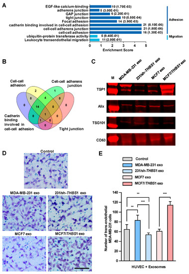Exosomal thrombospondin-1 (TSP1) enhances the transendothelial migration of breast cancer cells. (A) The biological processes revealed by Gene Ontology (GO) analysis of exosomal proteome identified from mass spectral data. The numbers after each column indicated the hit number in each subcategory and p-value in parenthesis. (B) Overlapping of GO enriched biological processes for exosomal proteome related to cell–cell junction. The number of genes contained in each cluster is indicated. (C) TSP1 expression in exosomes derived from parent and gene-transfected breast cancer cells by Western blot analyses. (D) Transendothelial migration of MDA-MB-231 after treating HUVECs with exosomes derived from breast cancer cells differentially expressing TSP1. Scale bar, 100 μm. (E) Quantitative analyses of the migrated MDA-MB-231 cells in transwell assay. Data are shown as mean ± SD and representative of three independent experiments. ** p < 0.01, *** p < 0.001 by unpaired Student’s t-test.
