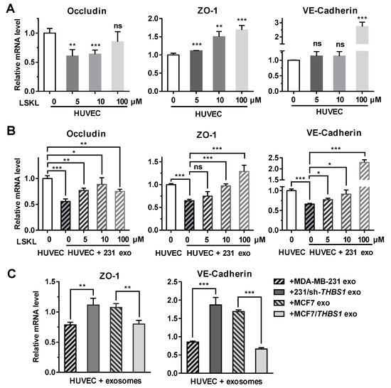 Exosomal TSP1 derived from breast cancer cells suppresses the expression of HUVEC intracellular junction proteins. (A) mRNA transcription level of occludin, ZO-1, VE-cadherin, in HUVECs treated with different amount of LSKL. (B) mRNA transcription level of occludin, ZO-1, VE-cadherin, in HUVECs treated with MDA-MB-231-derived exosomes and different concentrations of LSKL. (C) mRNA transcription level of ZO-1 and VE-cadherin in HUVECs treated with exosomes derived from breast cancer cells differentially expressing TSP1. Data are shown as mean ± SD and representative of three independent experiments. * p < 0.05, ** p < 0.01, *** p < 0.001; ns, no significance by unpaired Student’s t-test.