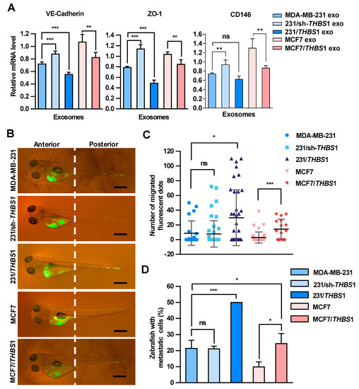 Zebrafish has been used as a useful vertebrate model to study metastatic processes of tumors [31]. To further examine the effect of TSP1 on the transendothelial migration of breast cancer cells, exosomes with various amounts of TSP1 were prepared from parent breast cancer cells and the transfectants (Figures S5 and S7), and then injected into zebrafish yolk sac. The expression of VE-cadherin, ZO-1, and CD146 in zebrafish was detected by qRT-PCR (Figure 6A). The results showed that exosomal TSP1 inhibited the mRNA expression level of VE-cadherin in zebrafish, which was specifically expressed in endothelial cells. Moreover, Dio-labeled breast cancer cells were injected into the zebrafish yolk sac and the migration of the tumor cells to the tail was monitored under a fluorescence microscope 48 h later (Figure 6B). It was clearly showed that the tail migration of tumor cells was more prominent for TSP1-overexpressing MDA-MB-231 cells compared to parent cells. Moreover, the tail metastasis proportion of the zebrafish group injected with tumor cells expressing a high level of TSP1 was significantly higher than that of other two groups (MDA-MB-231 and 231/sh-THBS1). Essentially the same phenomenon was found between MCF7/THBS1 and MCF7 cell groups (Figure 6C,D). The results collectively demonstrated that breast cancer cells expressing a high level of TSP1 exhibited a high level of metastatic potential in vivo.