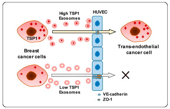 This study unveiled a novel mechanism underlying the interaction between breast cancer cell-derived exosomes and endothelial cells. Carcinoma-derived exosomes enhanced the transendothelial migration of breast cancer cells by reducing the expression of intercellular junction proteins. In addition, exosomal proteomic analysis revealed that TSP1 protein was the relevant promising candidate regulating endothelial adhesion and junction. Finally, carcinoma-derived exosomal TSP1 facilitated transendothelial cancer cell migration by decreasing the expression of intercellular junction proteins and disrupting intercellular integrity of endothelial cells both in vitro and in vivo (Figure 7).