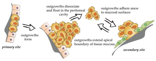 EOC dissemination rarely follows an invasion–metastasis cascade where single cells or collective cell populations break through the basal lamina, penetrate surrounding tissues, and intravasate into the vasculature [26,27]. EOC can form loosely attached outgrowths that extend the apical boundary of the tissue mucosa [28]. Outgrowths can completely detach (release) from the mucosa, transit through the peritoneal fluids, and attach to new sites [29] (Figure 1). This unusual route of dissemination is associated with tumor heterogeneity [30], development of resistant disease [31], and abdominal organ obstruction, which is the leading cause of patient morbidity and mortality [32]. Each step of EOC dissemination reflects a unique molecular mechanism and cellular phenotype. Understanding the molecular and cellular determinants of outgrowth formation, release, and interaction with the microenvironment will provide a fundamental framework that is required for the discovery of new therapies aimed at targeting peritoneal dissemination. In the sections below, we provide a description of known cellular and molecular processes that support distinct steps of EOC dissemination (refer to Table 2).