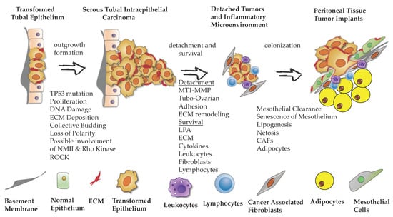 Cells detach because they lose adhesion to a basement membrane [108]. Upon release from the basement membrane, detached transformed cells either die [109] or continue to grow [110]. EOC outgrowths are often associated with the nearby presence of histologically and molecularly similar free-floating multicellular tumor clusters [111], indicating that outgrowths undergo detachment. The mechanisms responsible for detachment are not well understood. Early experiments utilizing two-dimensional monolayer cultures of ovarian cancer cell lines provided evidence that constitutively active membrane type 1 matrix metalloproteinase (MT1-MMP), through integrin α3 cleavage, promoted EOC monolayer sheet detachment [44]. Al Habyan et al. [45] demonstrated, using live-cell imaging, that ovarian cancer cells detached from a cellular cluster collectively or as single cells. Interestingly, most of the single cells died upon release, indicating that multicellular clusters that detach from spheroids bypass death associated with the loss of adhesion contact. Both of these studies indicated that mechanisms of adhesion regulation intrinsic to tumor cells are essential for the release of tumor clusters into the peritoneum. Microenvironmental factors could also influence how tumor outgrowths are released from the primary site. For instance, the close proximity of tubal mucosa to ovarian surface epithelium allows FTSECs to form adhesions with the mesothelium and grow directly on the surface of the ovary [46]. Recent evidence [112] suggests that individuals who underwent salpingectomy (removal of Fallopian tubes), for reasons other than ovarian cancer, possessed microscopic tubal tissue on the surface of the ovary, indicating the possibility that fallopian tube mucosa naturally comes in contact with the ovarian surface. Thus, it is conceivable to think that malignant outgrowths adhere to ovarian mesothelium before release. Supporting this possibility, there are ex vivo experiments demonstrating collective adhesion of transformed FTSECs to the surface of the ovary [47]. This mode of dissemination would lead to adhesion formation between the ovary and the fallopian tube. Due to fallopian tube movement, the nature of this attachment would be transient, leading to the rupture of tubo-ovarian tissue and release of tumor clusters into the peritoneum. Experiments in mice indicated that oophorectomy significantly decreased peritoneal dissemination, further reinforcing the idea that interplay between the fallopian tube and the ovary constitutes an important factor in supporting detachment and peritoneal dissemination [113]. A combination of tissue-engineering approaches focused on the development of organotypic co-culture systems that incorporate FTSECs and ovarian mesothelium would be required to study, in detail, the mechanism of tubo-ovarian adhesion and its importance in promoting transformed FTSEC detachment.