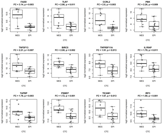 Genes implicated in NF-kappa B signaling were upregulated in primary tumors of breast cancer patients with mesenchymal CTCs (MES, n = 9) when compared to patients with epithelial CTCs (EPI, n = 14); the top 12 upregulated genes are presented. Gene expression depicted as number of counts of each probe and normalized to the four most stable reference genes (ABCF1, EDC3, HDAC3, and CNOT4); FC calculated on the basis of the median normalized counts of the probe in each group; differences in median normalized counts between groups analyzed with the Mann–Whitney U test (p); the bars correspond to the interquartile range (IQR), the whiskers cover 1.5 IQR from the median.