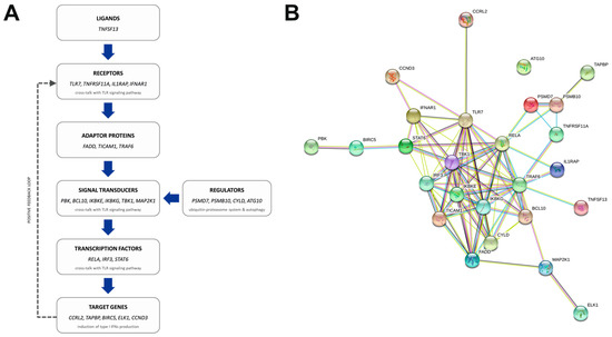 Our data revealed another interesting pattern of enrichment, with upregulation of several NF-kappa B-related genes that are particularly involved in the positive regulation of type I interferon production (Table S2). The cross-talk between NF-kappa B and Toll-like receptors (TLR)-mediated signaling results in an increased pro-inflammatory response that is additionally enhanced in an autocrine and paracrine manner by a positive feedback loop (Figure 3A) [50,51].