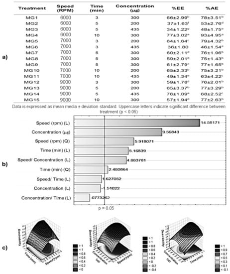 In Figure 1a, the EE% and EA% corresponding to the MG formulations are shown. The treatment that presented the highest encapsulation efficiency was MG4 (6000 rpm, 10 min, 300 μg) and MG14 (9000 rpm, 5 min, 435 μg) with EE% of 77 ± 3.02% and 76 ± 1.09%, respectively; while those of lower EE% were MG3 (6000 rpm, 5 min, 435 μg) and MG6 (7000 rpm, 3 min, 435 μg) with EE% values of 34 ± 1.22% and 36 ± 1.80%. Regarding the EA%, only MG4 presented significant difference with respect to the other treatments, presenting an AE% of 93 ± 4.95%, while the lowest corresponding to MG2 (6000 rpm, 5 min, 200 μg).