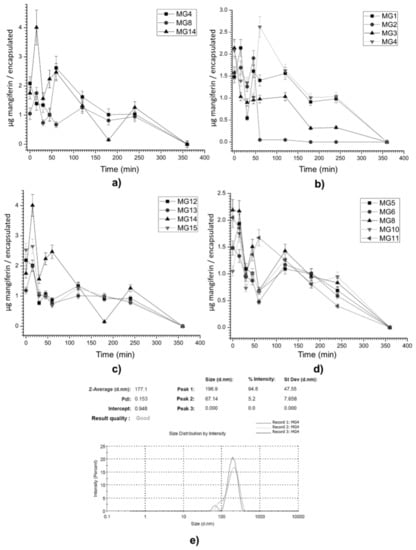Mangiferin release profile and size distribution of best treatment; (a) best release profiles, (b) treatments at 6000 rpm, (c) treatments at 7000 rpm, and (d) treatments at 9000 rpm. (e) Size distribution on optimal condition (MG4).