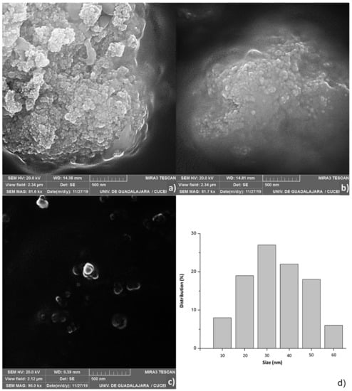 Figure 3 shows, scanning electron microscopy images of the optimal treatment (Figure 3a,b, MG4; Figure 3c, control). In the images related to MG4, agglomerations of nanoparticles can be seen, which were counted 100 particles independents, and Figure 3d shows the Pareto diagram of the size distribution of NPs. Previous studies show a similar behavior in agglomerated nanoparticles of the same polymer loaded with catechins larger than 500 nm; however, there is evidence that nanometer sizes are achieved with PLGA-loaded gold [,]. The results shown by SEM coincide with peak two of Figure 2e, which shows an average size of 67.14. It is possible that the dispersion of the particles is not adequate, and therefore, the distributions in that technique were greater, thus quantifying conglomerates of smaller particles.
