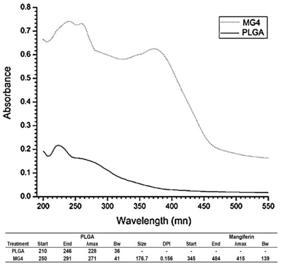 Fingerprint UV-vis of mangiferin optimal nanoparticles (MG4) and poly (lactic-co-glycolic acid) (PLGA).