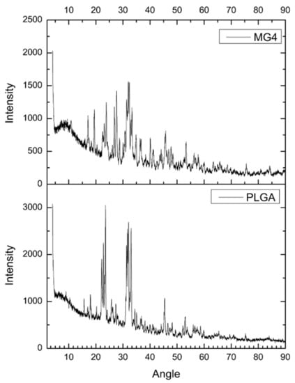 The powder X-ray diffraction patterns of MG and PLGA are illustrated in Figure 5. PLGA was in a crystalline form; however, in contrast, the XRD of the MG4 shows amplified signals corresponding to mangiferin between the θ 10–30 already described by other authors, indicating the change from a highly crystalline nature to an amorphous state of the complex mangiferin–PLGA [,]. However, these morphologies can also be attributed to the remnants of phosphate salts present in the formulation [].
