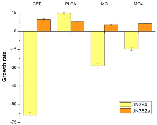 Growth rate of Camptotecin (CPT), poly (lactic-co-glycolic acid) (PLGA), mangiferin (MG), and mangiferin nanoparticles (MG4) in the proliferation of modified strains of Saccharomyces cereviseae JN362a and JN394.