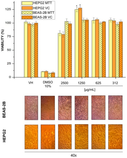 Cell viability of the various mangiferin nanoparticle concentrations for HepG2 and BEAS-2B cells using the violet crystal and MTT assay. * p ˂ 0.05, statistical difference between treatment and control.