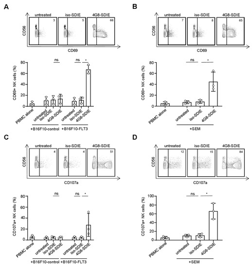 PBMC of healthy donors were cultured with or without the indicated target cells at an effector to target ratio of 2.5:1 in the presence or absence of 4G8-SDIE/iso-SDIE (1 µg/mL). CD69 expression on NK cells identified as CD19−CD56+CD3− lymphocytes after 24 h was analyzed by flow cytometry. For studies on NK cell degranulation, cells were cultured for 4 h in the presence of anti-CD107a-PE, BD GolgiStop and BD GolgiPlug (BD Biosciences). Subsequently, NK cells identified as mentioned above were analyzed by flow cytometric determination of CD107a.