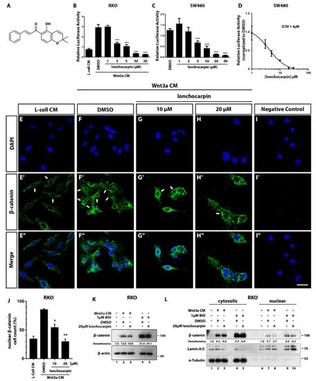 2.1. Lonchocarpin Inhibits Wnt/β-Catenin Pathway and Reduces Nuclear β-Catenin Levels