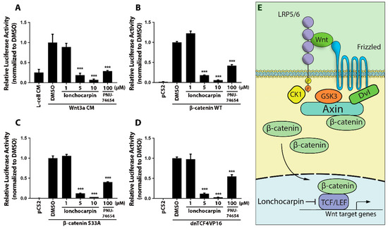 2.2. Lonchocarpin Inhibits the Canonical Wnt Pathway Downstream of the Destruction Complex