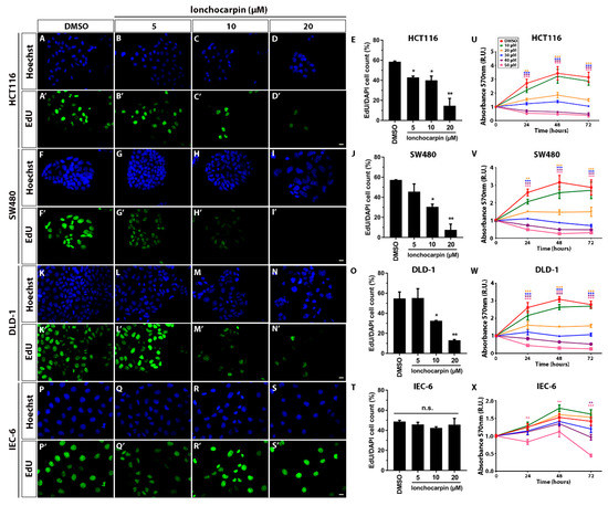 2.4. Lonchocarpin Reduces HCT116, SW480, and DLD-1 Cell Proliferation