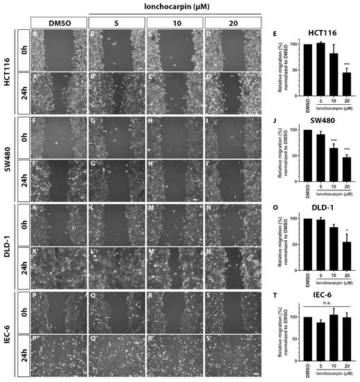 2.5. Lonchocarpin Reduces Cell Migration in HCT116, SW480, and DLD-1 Colorectal Cancer Cell Lines