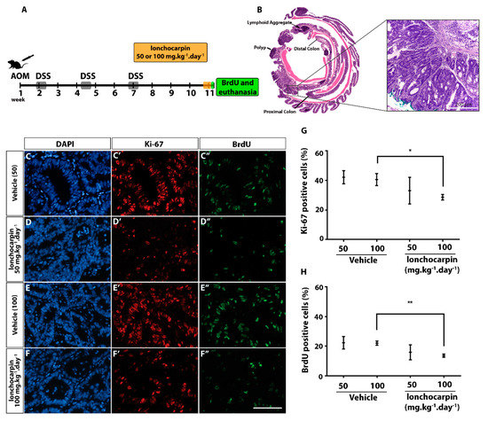 2.6. Lonchocarpin Decreases Cell Proliferation in Azoxymethane (AOM)/Dextran Sulfate Sodium (DSS) Induced Adenocarcinomas