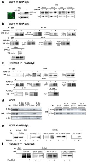 - Larive, R.M.; Urbach, S.; Poncet, J.; Jouin, P.; Mascré, G.; Sahuquet, A.; Mangeat, P.H.; Coopman, P.J.; Bettache, N. Phosphoproteomic analysis of Syk kinase signaling in human cancer cells reveals its role in cell-cell adhesion. Oncogene 2009, 28, 2337–2347. [Google Scholar] [CrossRef][Green Version]