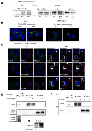 Membrane-associated E-Cdh in mature junctions is quickly renewed by endocytosis, thereby tightly controlling the number of functional processes []. To investigate the role of Syk-mediated phosphorylation in E-Cdh dynamics, we transfected HEK293T cells with wild type (WT) or mutant E-Cdh-GFP in which the four identified tyrosine residues (Y753/754, Y859, Y876) could not be phosphorylated (Y/F point mutation, Mut). With comparable expression levels of WT and Mut E-Cdh-GFP (slightly above endogenous E-Cdh) (Figure 3a, left panel), co-immunoprecipitation of α-Ctn and β-Ctn with E-Cdh were reduced by ≈60% in cells expressing Mut E-Cdh-GFP. Immunofluorescence analysis of MCF7 (Syk+/E-Cdh+) and MDA-MB-231 (Syk−/E-Cdh−) breast cancer cells transfected with WT or Mut E-Cdh-GFP showed that WT E-Cdh was mainly localized at AJ, whereas Mut E-Cdh-GFP was predominantly expressed in intracellular vesicles (Figure 3b). These vesicles were positive for RAB5, a key regulator of vesicular trafficking during early endocytosis, fluorescent transferrin, and early endosome antigen 1 (EEA1) (Figure 3c), indicating that they were early endosomes. These data suggest that inhibiting the Syk-mediated phosphorylation of E-Cdh stimulates its internalization and turnover.