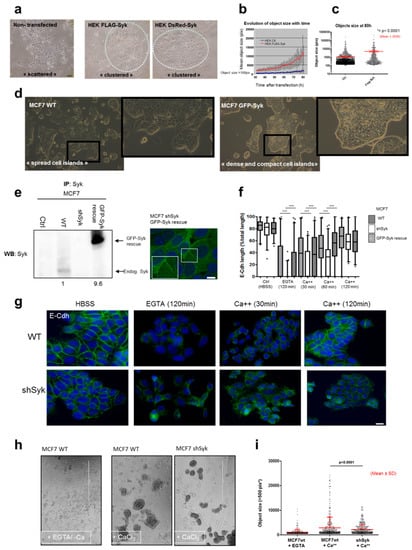 As cell-cell adhesion is mainly a three-dimensional phenomenon, we also performed 3D re-aggregation assays in which trypsinized parental and shSyk MCF7 cells were allowed to re-aggregate in E-Cdh destabilizing (EGTA) conditions and after Ca++ addition. Microscopy images revealed the presence of fewer but bigger cell aggregates in parental MCF7 cells compared with shSyk MCF7 cells after Ca++ addition (Figure 4h). Quantification of the number and size (>500 pix2) of the cell objects confirmed this difference (Figure 4i), indicating that Syk promotes E-Cdh recruitment and stabilization at AJ.