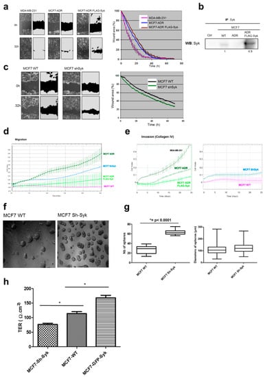 Enhanced Syk expression hinders cell migration and invasion, reduces the clonogenic potential, and maintains the epithelial integrity. (a) Confluent cell layers were scraped and cell migration into the wound was monitored by time-lapse microscopy for 70 h to quantify cell migration over time (right panel). MDA-MB-231 cells were used as a positive control of migrating, invasive breast cancer cells. (b) Parental (WT) MCF7, MCF7/ADR (Syk-/E-Cdh-), and FLAG-Syk-expressing MCF7/ADR cell lysates were immunoprecipitated (IP) and analyzed by Western blotting (WB) with anti-Syk antibodies. The numbers under the lanes indicate the relative expression levels determined by densitometry. (c) The same experiment as in (a) was performed with parental (WT) and shSyk MCF7 cells. Error bars represent the SD of triplicate wells. (d,e) Cell migration and invasion in collagen IV were assessed using the xCELLigence real-time cell analysis technology (Roche). Comparison of cell migration (d) and cell invasion (e) in MCF7/ADR, FLAG-Syk MCF7/ADR, parental MCF7 (WT), and shSyk MCF7 cells using the Cell Index (CI) as unit. Error bars represent the SD of triplicate wells. (f,g) Parental (WT) and shSyk MCF7 cells were seeded in a 3D Matrigel layer. At day 14 post-seeding, the resulting spheres were observed by bright-field microscopy (f) and their number and diameter were quantified (g) *** p value < 0.0001 (Mann–Whitney test). (h) Transepithelial resistance (TER) measurement of highly confluent and tight monolayers of parental (WT), shSyk, and GFP-Syk MCF7 cells. Results represent the mean ± SD of triplicate wells; * p value < 0.05 (paired t-test).