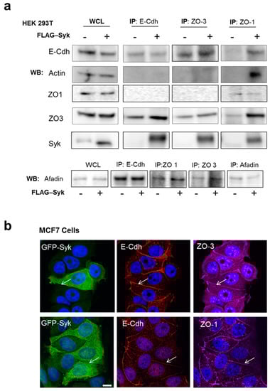 To understand how Syk stabilizes cell-cell interactions and epithelial integrity, we performed co-immunoprecipitation experiments using parental and FLAG-Syk HEK293T cells and antibodies against junctional complex components involved in the interaction of E-Cdh/Ctn complexes with the actin cytoskeleton (Figure 6a). Syk transfection promoted the interaction of E-Cdh with zonula occludens 3 (ZO3) and Syk. It also promoted E-Cdh, actin, ZO3, and Syk co-immunoprecipitation with ZO1 and thus appears to be a major linker between the E-Cdh/Ctn complexes and the actin cytoskeleton. ZO1 and ZO3 also co-immunoprecipitated afadin, an actin filament-binding protein that colocalizes at cadherin-based AJ. Immunofluorescence analysis of GFP-Syk MCF7 cells showed that ZO1 and ZO3 partly colocalized with E-Cdh and Syk (Figure 6b). This suggests that they might locally interact and form a complex that links E-Cdh/Ctn with the actin cytoskeleton.