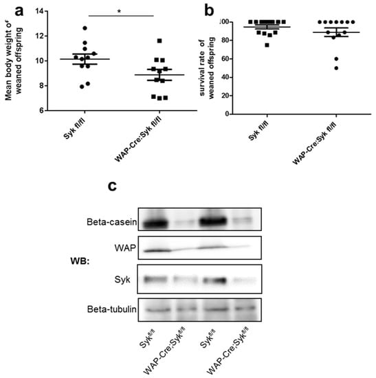 Reduced weight of the weaned offspring of mice with conditionally ablated Syk in the mammary glands is associated with decreased milk protein expression. (a) Body weight in grams (mean ± SEM) of the weaned offspring of Sykfl/fl (control) and Wap-Cre;Sykfl/fl mice (n = 11 mice/group; * p < 0.05, Mann–Whitney test). (b) Survival rate (mean ± SEM) of Sykfl/fl and Wap-Cre;Sykfl/fl offspring at weaning (n = 14 for Sykfl/fl mice and n = 13 for Wap-Cre;Sykfl/fl mice). (c) Representative Western blot image of Sykfl/fl and Wap-Cre;Sykfl/fl mammary epithelial cell lysates from four independent mothers at weaning after two pregnancies probed with anti-β-casein, anti-WAP antibodies. Syk expression levels were verified by Western blot (c) and by immunohistochemistry (Supplementary Figure S6d,e). (β-tubulin: loading control).
