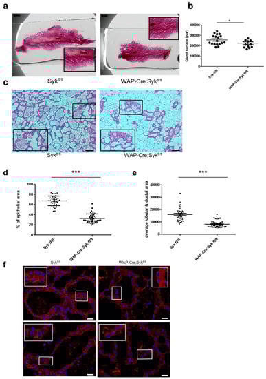 E-Cdh is essential for the development of the epithelial architecture and phenotype by promoting tight connections between epithelial cells []. To verify the role of Syk in E-Cdh/Ctn complex stabilization in vivo, we examined the consequences of Syk loss during mouse mammary gland development. As Syk deletion is perinatal lethal in mice [,], we deleted Syk exclusively in the differentiating mammary gland by breeding floxed Syk mice (Sykfl/fl) with Wap-Cre transgenic mice that express the Cre-recombinase gene under the control of the lactogenic hormone-induced whey acidic protein (Wap) gene promoter []. Genomic PCR of epithelial cells isolated from Wap-Cre;Sykfl/fl Syk conditional knockout (cKO) lactating mammary glands at weaning after two pregnancies [] confirmed excision of the Syk allele (Supplementary Figure S6a). The specificity of the anti-Syk antibody was verified on paraffin sections of Syk− (MDA-MB-231), Syk+ (MCF7), and Syk-transfected (MCF7-GFP-Syk) cell lines (Supplementary Figure S6b). Syk expression was strongly present in the mammary gland luminal epithelium and in lymphocyte subsets in the lymph nodes (Supplementary Figure S7). We confirmed the loss of Syk expression in the mammary epithelium of cKO Syk mice by immunohistochemical analysis (Supplementary Figure S6d,e). Macroscopically, Syk cKO pups appeared identical to Sykfl/fl pups at weaning. However, their body weight was lower, probably due to the decreased expression of milk proteins (β-casein and WAP) by epithelial cells of the mother’s lactating mammary glands (Figure 7a–c). Moreover, the overall size of carmine red-stained whole-mount lactating mammary gland preparations at weaning after two pregnancies was significantly lower in Syk cKO mice compared with Sykfl/fl control mice (Figure 8a,b). In virgin mice, the epithelium of the adult mammary gland embedded in the stroma is traditionally described as a bilayer of apically oriented luminal secretory cells that undergo functional differentiation in pregnancy to produce milk, and of basally contractile myoepithelial cells that participate in milk delivery []. Microscopy analysis of the morphology and organization of the mammary epithelium (ducts and lobules) after hematoxylin/eosin (H&E) staining of lactating mammary glands at weaning showed the presence of fewer epithelial areas (ducts and lobules) within the stroma and significantly less secretory units, composed of ducts and lobules, in Syk cKO than in Sykfl/fl mice (Figure 8c–e). The alveoli were condensed, disorganized, and less developed with small lumina, suggesting perturbed alveologenesis of the lactating mammary gland. H&E staining of involuting mammary gland tissue sections (3 days after weaning) in Sykfl/fl and Syk cKO Syk mice displayed the same perturbed phenotype as during lactation (Supplementary Figure S8). Analysis of E-Cdh expression in mammary gland showed that E-Cdh localization at the intercellular junctions of mammary epithelial cells was lost in Syk cKO mammary glands, whereas E-Cdh cytoplasmic expression was not affected (Figure 8f). These in vivo data support the in vitro observations indicating that Syk stabilizes the E-Cdh/Ctn complex at the intercellular junctions.