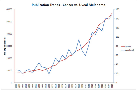 The search terms “uveal melanoma” and “cancer” show similar publication dynamics. Interestingly, in 2015 1,633,390 new cases of cancers were registered in the United States (https://www.cdc.gov/cancer/uscs/about/data-briefs/no3-USCS-highlights-2015-incidence.htm), 3360 of which were uveal melanomas (https://www.cancer.net/cancer-types/eye-cancer/statistics), a ratio of approximately 0.0021 that compares to the ratio of approximately 0.0023 of “uveal melanoma” over “cancer” publications. At present, the clinical trial database (https://clinicaltrials.gov/; interrogated on 18 November 2019) lists 71,324 clinical trials, 148 of which include uveal melanoma patients, a ratio of approximately 0.0021.