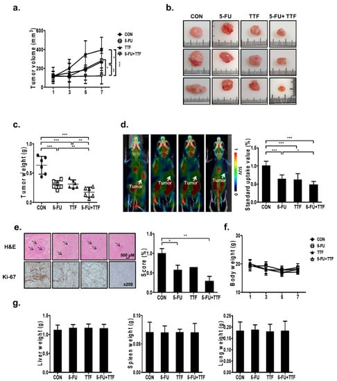 The TTFields-sensitizing effects of 5-FU on the colon, in in vivo models. (a) Nude mice were inoculated with HCT116 cells and treated with 5-FU or TTFields or a combination of both. Tumor volumes were measured at the indicated time points as shown using the formula: Volume = (Length × Width2) × 3.14/6 (n = 6); * p < 0.05, ** p < 0.01, *** p < 0.001. (b) Image of isolated tumors derived from control or TTFields-treated mice. bar = 1 cm. (c) Tumors were excised and weighed at the end of the experiment (seven days); ** p < 0.01, *** p < 0.001. (d) Representative positron emission tomography (PET)/computed tomography (CT) images of HCT116 tumor-bearing mice after injection of [18F]-FDG. The radioactivity of [18F]-FDG in tumors is presented as the maximal value of standard uptake values (SUV) (mean ± standard deviation (SD)); * p < 0.05, *** p < 0.001. (e) hematoxylin and eosin (H&E) and Ki-67 staining was conducted by immunohistochemistry, * p < 0.05, ** p < 0.01. (f,g) The liver, spleen, and lung tissues of mice were weighed at the last experiment (seven days).