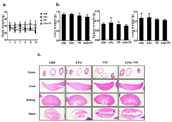 To study typical tissue complications in vivo after combinatorial treatment, mice were treated with 5-FU or TTFields for 14 days without injecting tumors (Figure 2). During the treatment, the mice in the control and treatment groups showed negligible body and organ weight differences, suggesting that the combination treatment did not lead to inordinate stress in the treated mice (Figure 2a,b). The H&E staining was performed using organs obtained from the control mice, the mice treated with 5-FU or TTFields, or the combination group for 14 days (Figure 2c). Fourteen days of combinatorial treatment did not show severe pathologic abnormalities in normal tissues (Figure 2c). Collectively, the above data suggest that TTFields combined with 5-FU inhibits the growth of colon cancer in vivo without pathologic abnormalities in normal tissues.