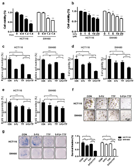 To investigate the sensitizing effects of the combinatorial treatment in colon cancer cell lines, first of all, we applied various voltages to HCT116 and SW480 cells for 48 h to select the optimal voltage for TTFields (Figure 3a). Both colon cancer cell lines showed decreased cell viability, depending on the voltage applied, with approximately 10% viability inhibition observed at 0.9 V/cm. Next, HCT116 and SW480 cells were treated with different concentrations of 5-FU to evaluate its effects on colon cancer cells in 3-(4,5-dimethylthiazol-2-yl)-2,5-diphenyltetrazolium bromide (MTT) assays (Figure 3b). Cell growth was significantly inhibited (p < 0.001) after a 48-h treatment with ≥10 µM 5-FU. These data indicated that HCT116 and SW480 cells showed concentration-dependent 5-FU sensitivity.