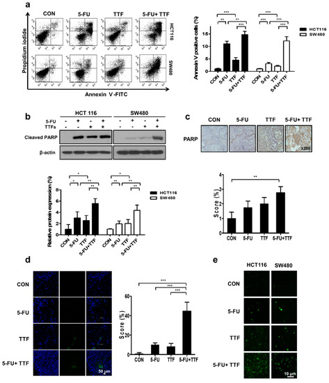 Our results also showed that cell death rates increased with increasing time after the TTFields application (Figure 4). We also examined whether the 5-FU-dependent enhancement of TTFields-induced cytotoxicity resulted from activation of the chief executioner of cell death, PARP fragmentation, in colon cancer cells (Figure 4b). To determine whether combinatorial therapy induces apoptosis in vivo, we investigated the apoptotic rate using PARP and a terminal deoxynucleotidyl transferase-mediated dUTP nick-154 end labeling (TUNEL) assay. Apoptotic cell death was increased upon combinatorial treatment by 2 assays (Figure 4c,d). We also investigated the relationship between the reactive oxygen species (ROS) and TTFields-induced apoptosis by TTFields in colon cancer cells. ROS level was significantly increased more by combination treatment with TTFields and 5-FU than by TTFields or 5-FU alone.