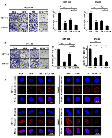 Effect of treatment with 5-FU and TTFields on the migration and invasion of colon cancer cells. (a) Tumor cell migration was assessed using the Transwell migration assay; ** p < 0.01, *** p < 0.001; Values represent the means ± SD (n = 3). (b) Tumor cell invasion was assayed using the Matrigel invasion assay; *** p < 0.001. (c) Immunocytochemistry staining of E-cadherin and vimentin expression with and without TTFields treatment or with and without 5-FU treatment.