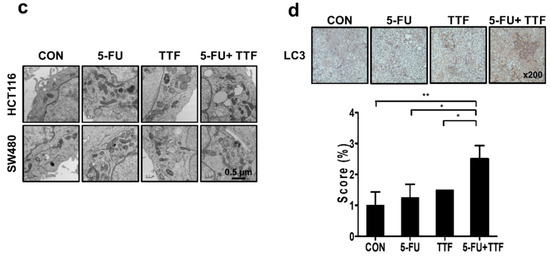 To further study the anticancer effects of 5-FU and TTFields, we investigated other cellular responses (autophagy in particular) associated with cell death after 5-FU or TTFields treatment. The expression of LC3 protein was determined (Figure 6a). Western blot analysis (an upper band of 18 kDa for LC3-bI and a lower band of 16 kDa for LC3-bII) showed that autophagosome-lysosome fusion increased with the indicated time after combination treatment. As shown in Figure 6b, there was increased accumulation of Cyto-ID Green around combination-treated HCT116 and SW480 cells. Moreover, transmission electron microscopy was used to prove autophagosome formation in combination-treated cells (Figure 6c). As shown in Figure 6c, combination treatment showed accumulation of large autophagic vacuoles with a typical double-layer membrane and organelle remnants, whereas only a few vacuoles were observed in cells with individual treatment. Furthermore, in vivo mouse xenografts were stained for LC3, to confirm whether the combination treatment could induce greater autophagy than single treatments (Figure 6e). Collectively, our data showed that autophagy was involved in colon cancer cell death after combination treatment in vitro and in vivo.